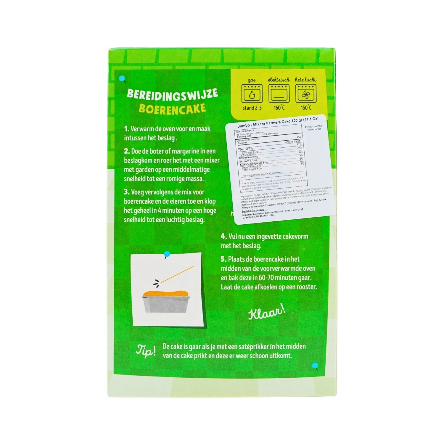 Jumbo Boerencake Mix brings authentic Dutch baking tradition to your kitchen. This 14 oz box contains everything you need to create a tender, buttery pound cake with rich vanilla notes and a delicate crumb. Perfect for breakfast, dessert, or afternoon tea, simply add eggs and butter to transform this premium mix into a homemade treat that tastes freshly baked. Ideal for both experienced bakers and kitchen newcomers seeking foolproof results.