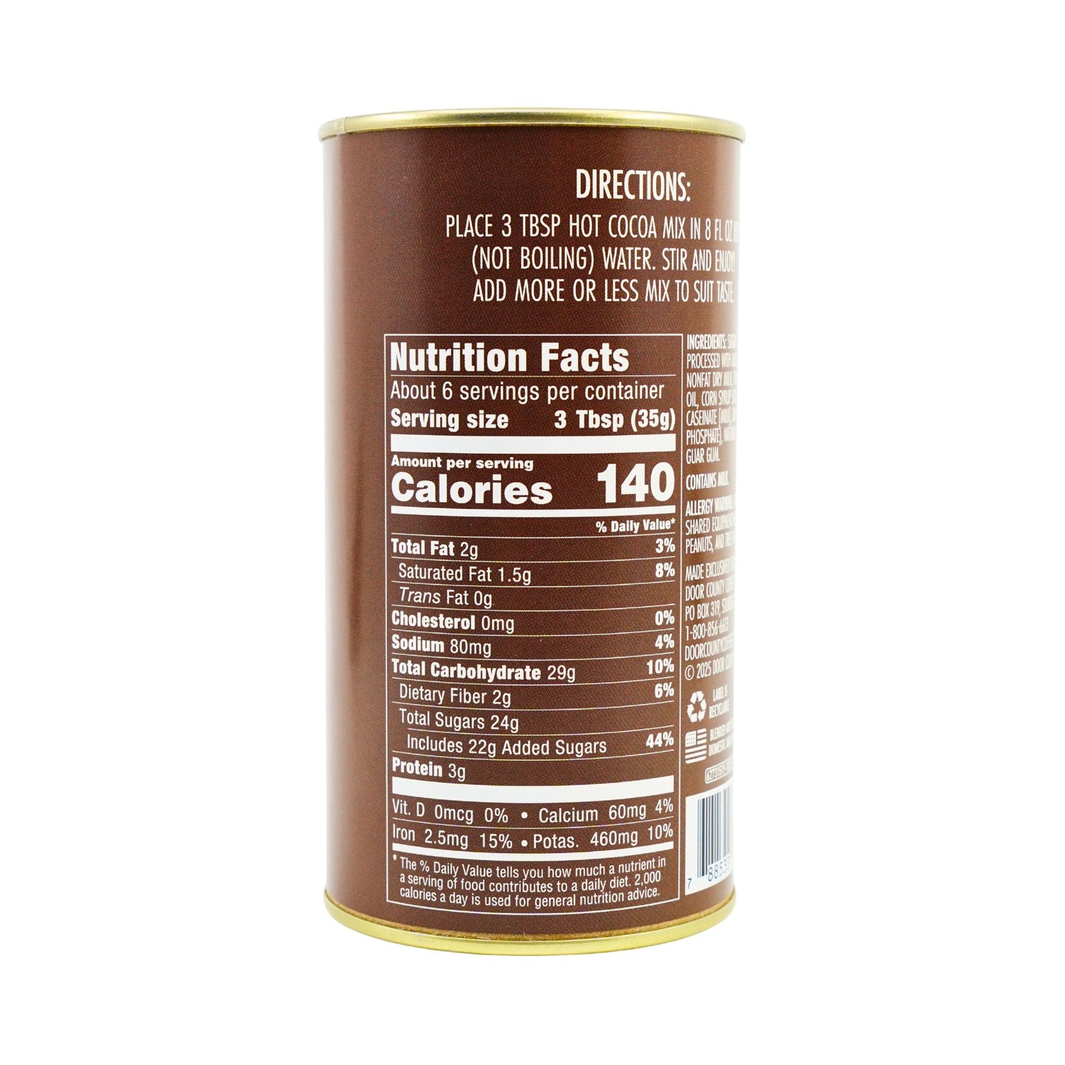 Ingredients: sugar, cocoa powder (Dutch process), whey (milk), nonfat dry milk, creamer (coconut oil, corn syrup solids, sodium caseinate {milk}, dipotassium phosphate), natural flavors, salt, guar gum.