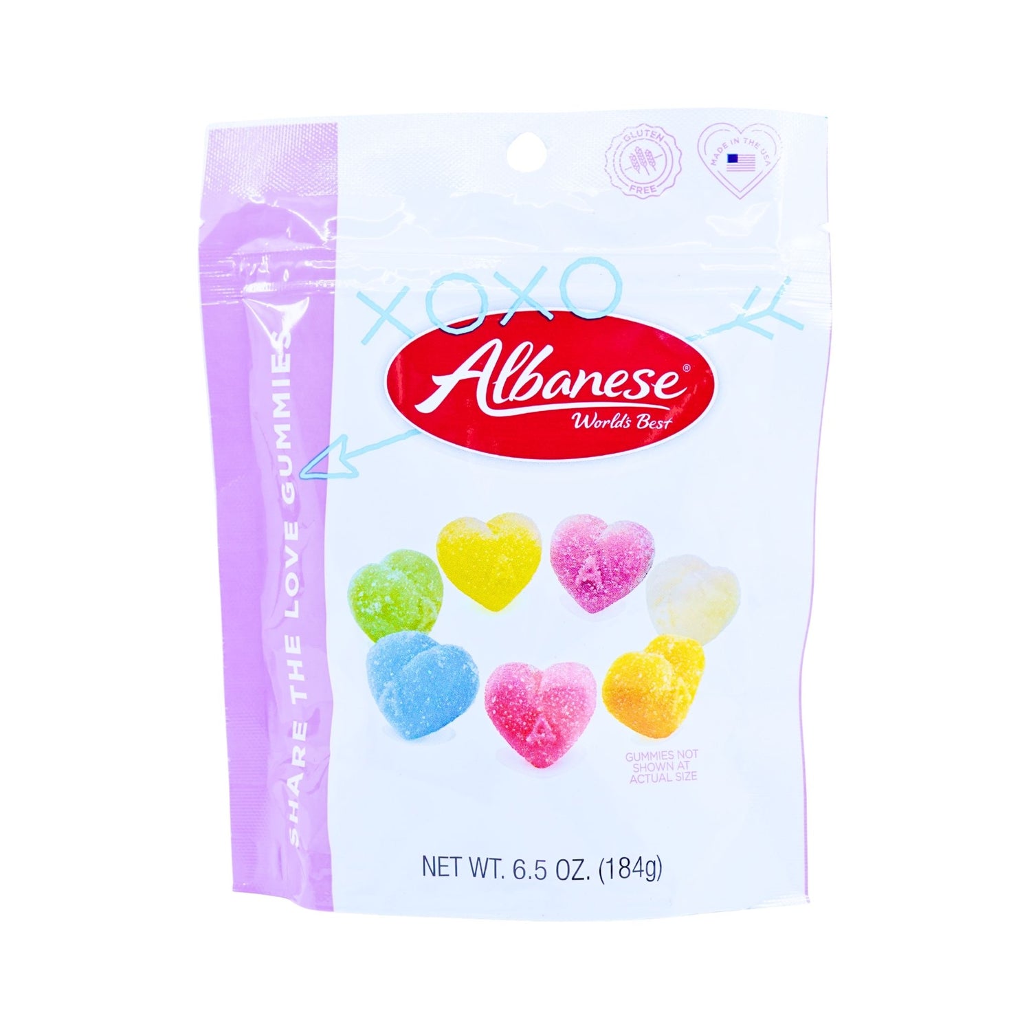 Albanese gummies have earned their reputation as a gourmet confection favorite. These blue raspberry, strawberry, mango, green apple, orange, grape and pineapple flavored heart gummies are the perfect treat for yourself or your valentine. This 6.5 oz resealable pouch is great for snacking on the go.